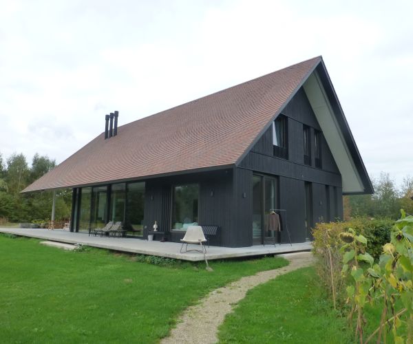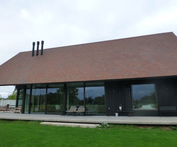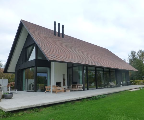 Strakke en mooie nieuwbouw villa gedekt met Engelse ACME leipannen type Smooth Brindle. Deze leipannen staan niet alleen bekend om de hoogwaardige kwaliteit maar ook om de mooie kleuren. De harde en mooi gekleurde gebakken lei komt goed tot zijn recht op deze villa.