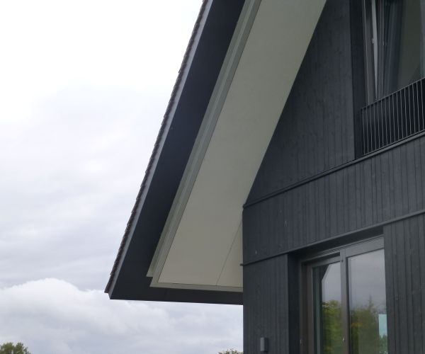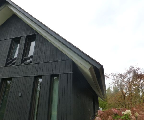 De leipannen zijn aan de windzijde 1:1 genageld. De randafwerking d.m.v. een overstek. De terugliggende boeiboorden zijn ingekeept waardoor de leipannen 40 mm doorsteken.